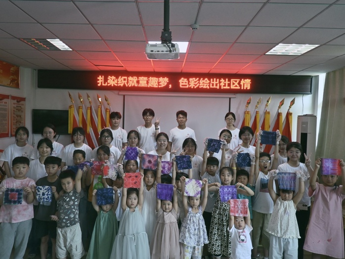 团队前往颍阳社区,开展扎染知识讲解活动。活动现场,团队成员借助PPT与实物展示,向社区小朋友介绍扎染的历史、工艺及技巧,并为每位小朋友发放扎染材料。在队员们的指导下,小朋友们对白色布料进行折叠、捆扎,再浸入染料中染色,最终呈现出各具特色的扎染作品。