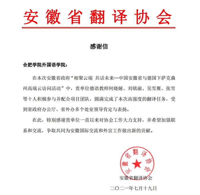 早在6月中旬,受安徽省翻译协会委托,外国语学院积极组织德语教师组建10人翻译团队,为此次会议的顺利召开提供语言保障,并完成《中华人民共和国安徽省人民政府与德意志联邦共和国下萨克森州政府关于进一步深化友好省州关系合作意向书》、《安徽省与下萨克森州意向签约项目表》、《安徽省与下萨克森州宣介片》等文件的笔译工作。德语教师们以出色的外语能力和实际行动完成翻译工作,也传递出了助力安徽对外交流的热情和决心。