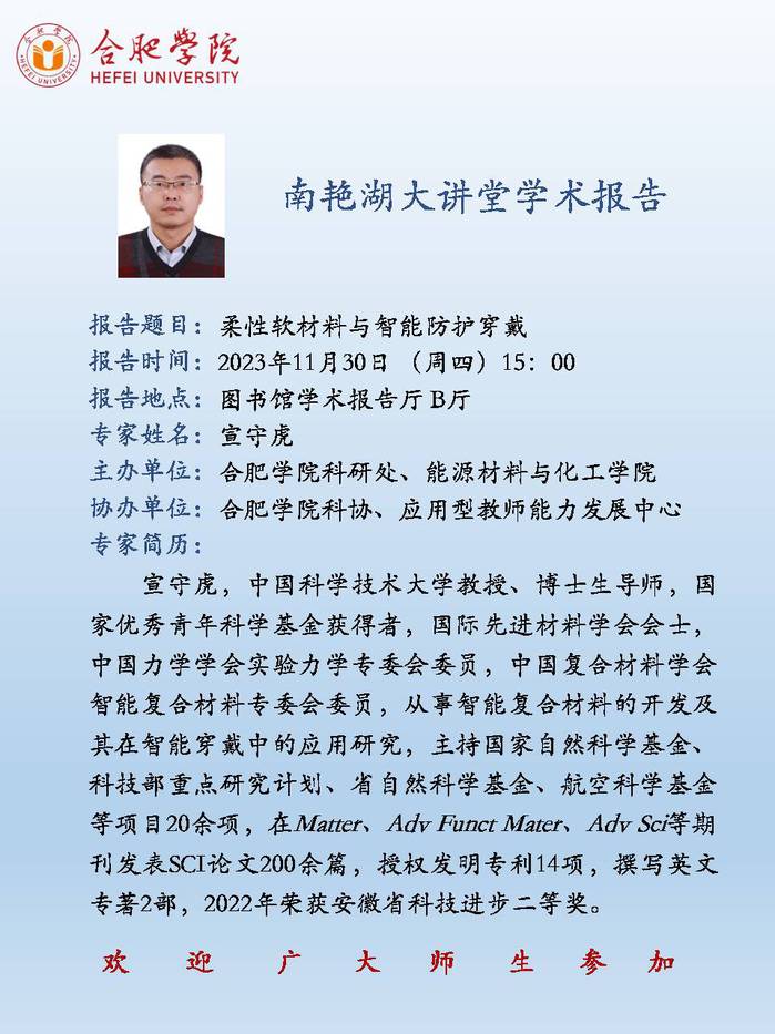 【南艳湖大讲堂】柔性软材料与智能防护穿戴
