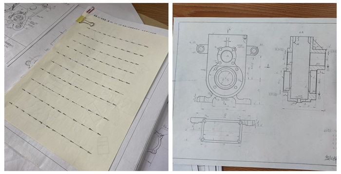 在刘丹萍老师的办公桌上,叠放着各种尺寸的工科图纸、日常的课程构型集训题和指导学生参赛的绘图试卷,小山一样的材料将她团团围住,虽然已经记不清修改了多少遍,但她对班上每个学生的作图风格如数家珍。